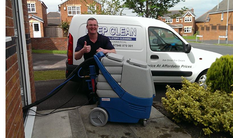 "Hi, I'm Martyn Clegg, a local carpet & upholstery cleaning technician with over 12 years experience. My business Deep Clean Carpet & Upholstery Cleaning is local and independent. You are assured of a high quality service at great prices. The picture is me and my top of the range "Prochem Powerplus". This machine stays outside your property and with 100ft of pipe extensions I can reach every part of your property."